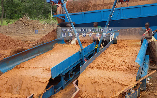 蠕動溜槽又稱為鼓動溜槽,基本上保留了固定流槽,而將原有的鐵制底板改為橡膠底板,再加上簡單的偏心鼓動機構(gòu),使橡膠底板做上、下往復(fù)運動,每個溜格之間類似于跳汰機的隔膜作用。從而解決了溜格的板結(jié)現(xiàn)象,提高了金的回收率。由于鼓動溜槽是間斷排出精礦,所以富集比要比跳汰機高,屬于間歇式排精礦,連續(xù)排尾礦。