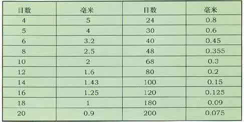 目数毫米对照表