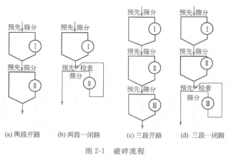 选矿设备厂较常见的有两段破碎流程与三段破碎流程。两段破碎流程又分为两段开路[图2—1(a)]和两段闭路[图2—1(b)]。后者的第二段破碎机与检查筛分成闭路,这就能保证产品粒度符合要求,不致影响下一步磨矿作业。二段流程只适合于地下开采方法的小型矿山,其总破碎比不大,一般在15~25左右,破碎矿石量也不多,常常小于1000吨/日。 两段开路流程很少使用,只是在某些重选厂用两段开路流程,把所得的破...[詳情]