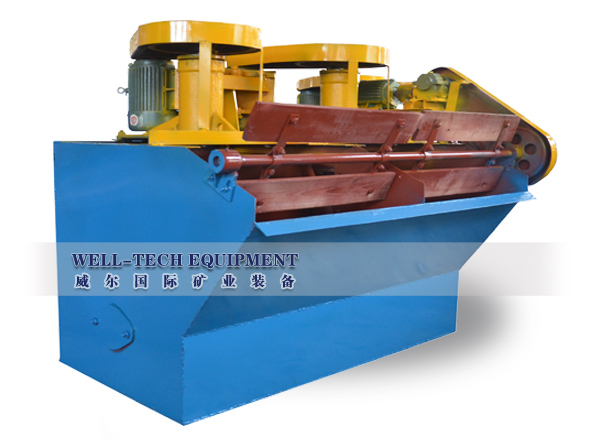 XJK型漂浮选矿机是我国使用较为普遍的一种漂浮选矿机。这种漂浮选矿机的构造如图6—34所示。一般四个槽子配成一组,分为吸入槽(有吸浆管22)与直流槽(无吸浆管)。漂浮选矿机工作时,电机通过皮带轮19和13带动主轴3旋转,叶轮5随主轴3一同旋转。这样在盖板7和叶轮5之间形成局部真空区(负压区),空气由吸气管11经空气筒22被吸人,同时矿浆经吸浆管22被吸入,矿浆与空气混合后借叶轮旋转所产生的离心力,矿浆中的空气...[詳情]