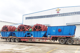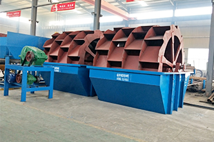 洗沙机工作时,动力装置通过三角带、减速机、齿轮减速后带动叶轮缓慢转动,砂石由给料槽进入洗槽中,在叶轮的带动下翻滚,并互相研磨,除去覆盖砂石表面的杂质,同时破坏包覆砂粒的水汽层,以利于脱水;同时加水,形成强大水流,及时将杂质及比重小的异物带走,并从溢出口洗槽排出,完成清洗过程。