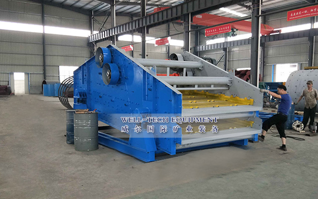 3、振動(dòng)篩。包括機(jī)械振動(dòng)篩和電力振動(dòng)篩兩種。屬于前者的有慣性振動(dòng)篩、自定中心振動(dòng)篩、直線振動(dòng)篩和共振篩。屬于后者的有點(diǎn)振動(dòng)篩。根據(jù)篩面運(yùn)動(dòng)軌跡不用又可分為圓振動(dòng)篩和直線振動(dòng)篩兩種,圓振動(dòng)篩是由不平衡振動(dòng)器的回轉(zhuǎn)質(zhì)量產(chǎn)生的激烈振力使篩體產(chǎn)生劇烈的振動(dòng)作用,篩子的運(yùn)動(dòng)軌跡為圓形或接近圓形,由于篩分的效率比較高,目前在選礦廠中應(yīng)用最廣泛。直線振動(dòng)篩由振動(dòng)器定向拖動(dòng)篩子,篩框?yàn)樗桨惭b運(yùn)動(dòng)軌跡成直線振動(dòng),以保證無聊在篩面上產(chǎn)生劇烈的抖動(dòng),主要用于煤的脫水分級(jí)、脫介、脫泥,也可用在磁鐵礦的沖洗、脫泥和分級(jí)等。