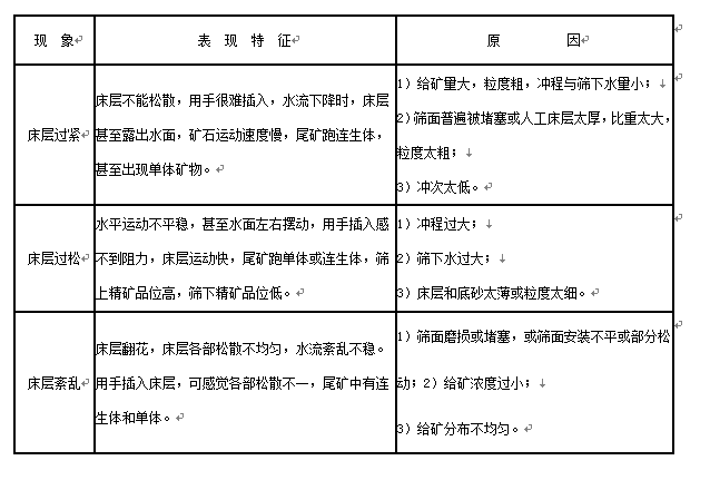 床層運動的正常與否,是決定分選指標的重要因素之一。跳汰機正常的床層松散表現(xiàn)是:床層脈動松散平穩(wěn),用手插入時,感到阻力不大,容易插入。檢查床層,礦粒按比重分層分明,尾礦不跑連生體,精礦品位和回收率較高。床層運動不正常,有以下幾種現(xiàn)象,表現(xiàn)特征及其原因見下表。