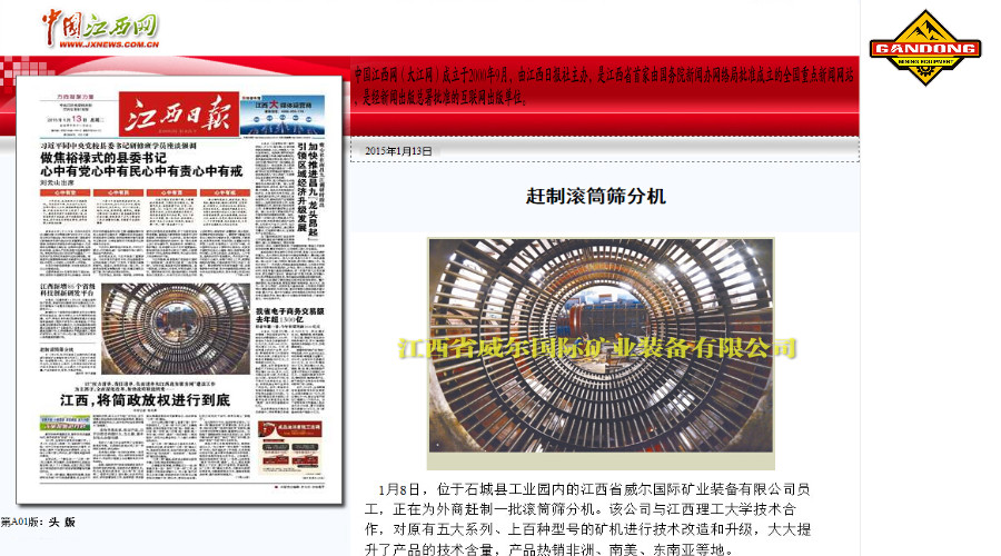 2015年1月13號(hào)江西日報(bào).中國江西網(wǎng)【第A01版】頭版報(bào)道我公司出口滾筒篩分機(jī)加工現(xiàn)場,新聞內(nèi)容: