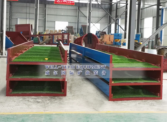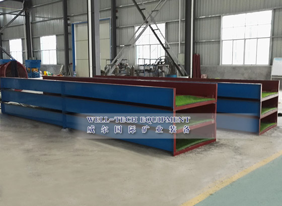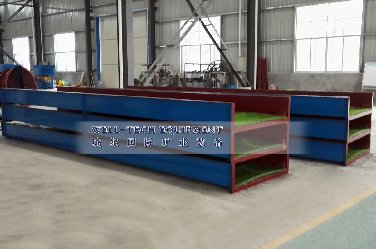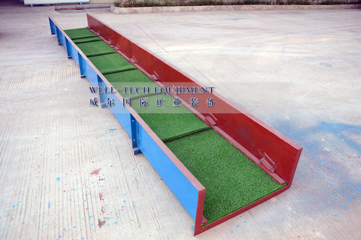 粘金溜槽是以前最受歡迎的選金設(shè)備之一,通常由溜槽體、溜槽格和粘金毯組成。粘金溜槽通常用于砂金選廠,廣泛地與滾筒篩組合一起使用可直接回收黃金。